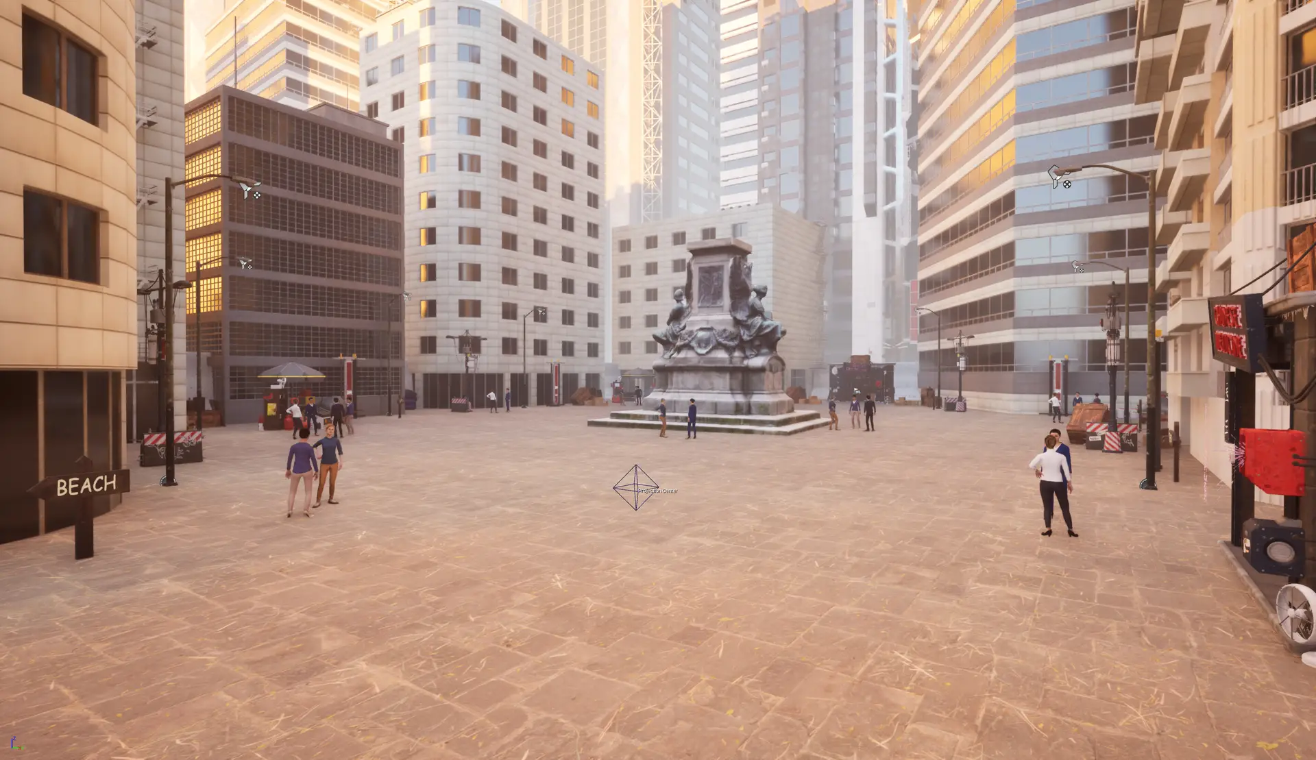 - Urban Zone – Modern high-rise architecture with dynamic traffic and crowd systems
